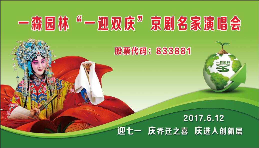 一森園林“一迎雙慶”京劇名家演唱會(huì)將于今晚8點(diǎn)在元龍國際酒店隆重舉行,屆時(shí)京劇梅花獎(jiǎng)得主趙玉華領(lǐng)銜主演。“一迎”即迎“七一”,“雙慶”一慶一森園林登錄新三板創(chuàng)新層,二慶一森園林喬遷之喜,一森園林公司地址由河北省石家莊市元氏縣常山路131號(hào)京東大廈遷至河北省石家莊市元氏縣常山路180號(hào)元龍國際酒店6樓。